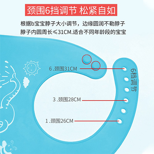 硅膠材質的圍兜,相對于其他材質清潔起來十分方便,水沖即可,耐溫、耐油、防水耐臟、清洗速干,直接可以下一頓飯使用,根本不需要擔心圍兜干不了的問題。硅膠材質質地柔軟、親膚且具有彈性,耐拉扯,可折疊,收納起來也方便,出門攜帶也很不錯。圍兜設計六個紐扣,不易散開,確保寶寶亂抓,圍兜也不輕易掉。圍兜紐扣可調節頸圈大小,適合各個年齡階段的寶寶,可以從小用到大,十分耐用。圍兜底部設計了一個前兜,可以接住食物,以防食物散落在寶寶身上和地上,寶媽清潔起來也十分方便。它是一款食品級硅膠,不含BPA,安全無毒,符合美國FDA嚴格檢測,就算食物掉到圍兜里,寶寶也可以撿起來吃,培養寶寶不浪費食物的好習慣。