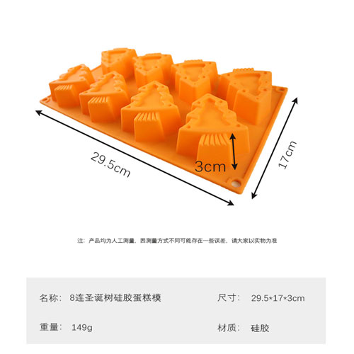 8連圣誕樹蛋糕模采用食品級硅膠制成,無毒無味,耐高溫,符合美國FDA標準,環保無公害,使用壽命長,質地柔軟,抗撕裂,手感好,不怕摔不怕壓,攜帶方便,適用于微波爐、烤箱、冰箱、冰柜、洗碗機